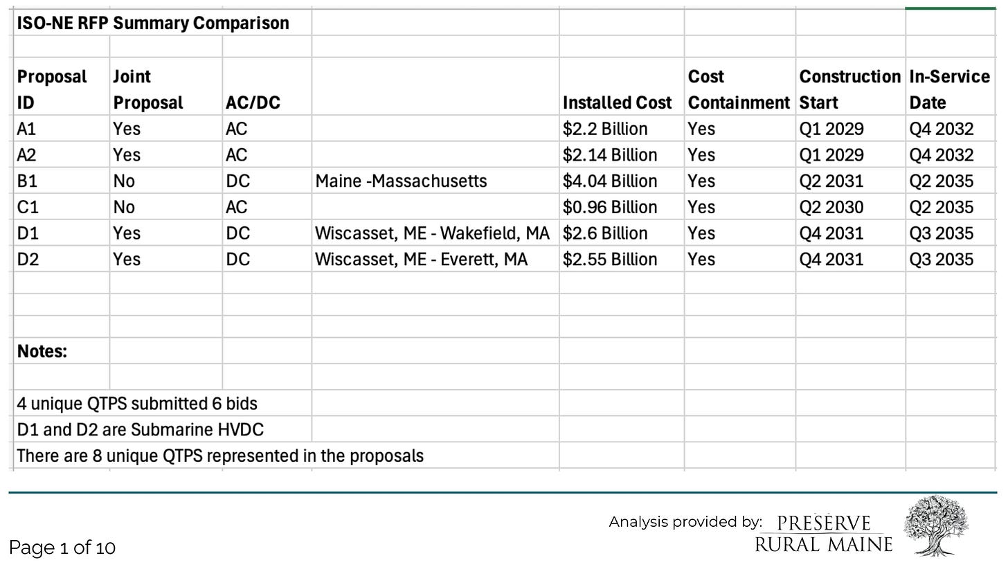 ISO-NE recently posted responses to their Long Term Planning RFP. These responses are definitely not “apples-to-apples” and thus require analysis to understand. Preserve Rural Maine has kindly put together a spreadsheet.