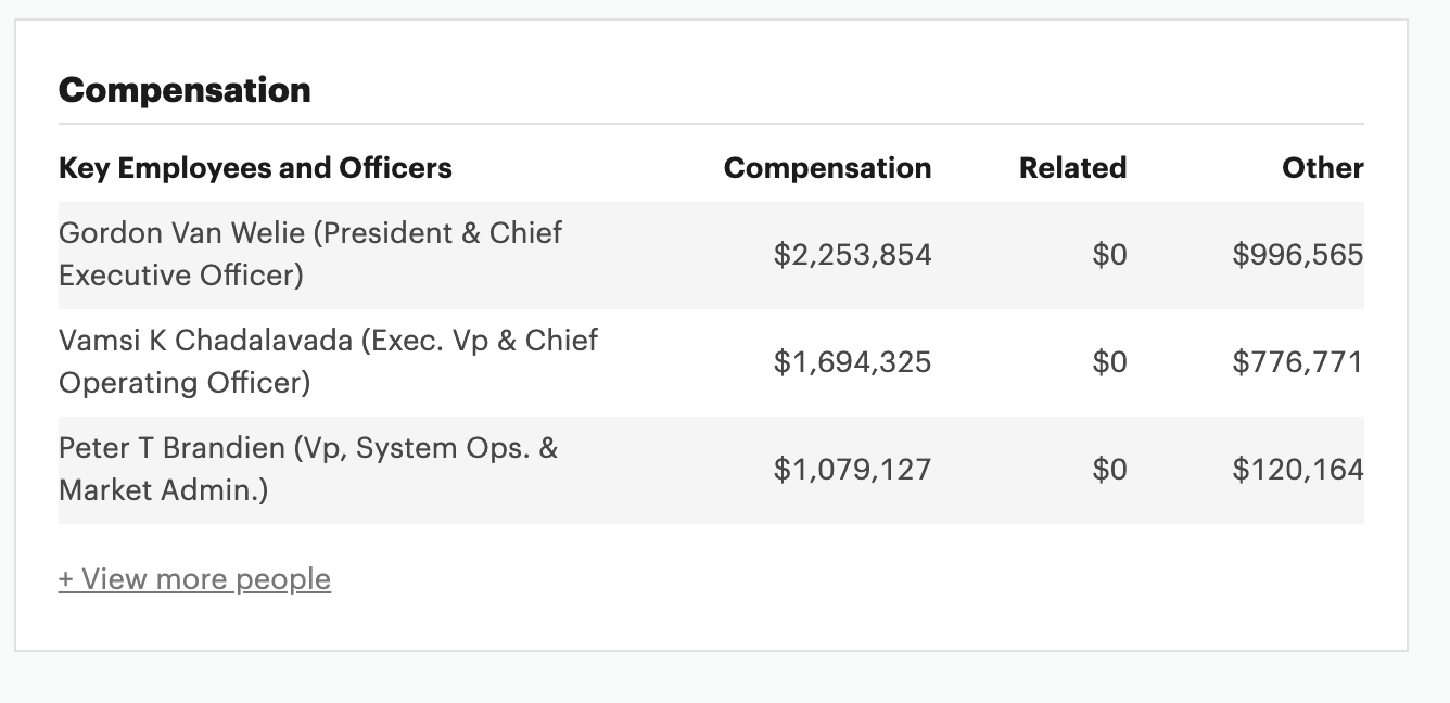 ISO-NE has revenues of $265 million. Their CEO earned $2,253,854 in 2024. (Plus another $996k additional compensation?)