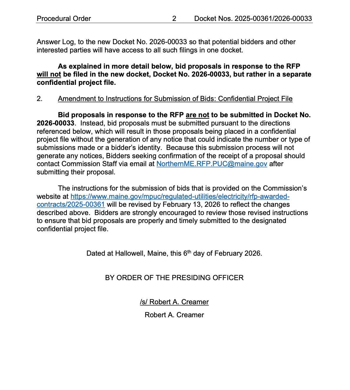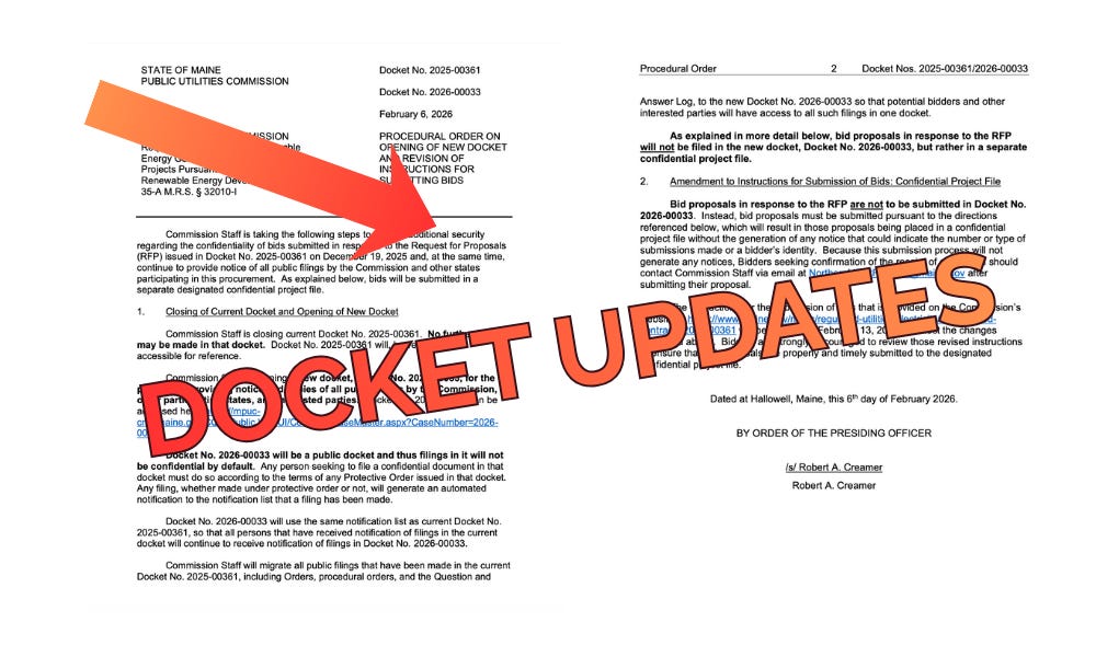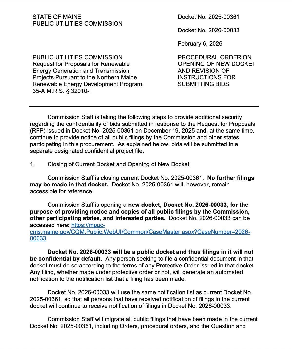 The original Northern Maine Transmission Line docket (2025-00361) has been closed, and a new one opened (2026-00033).