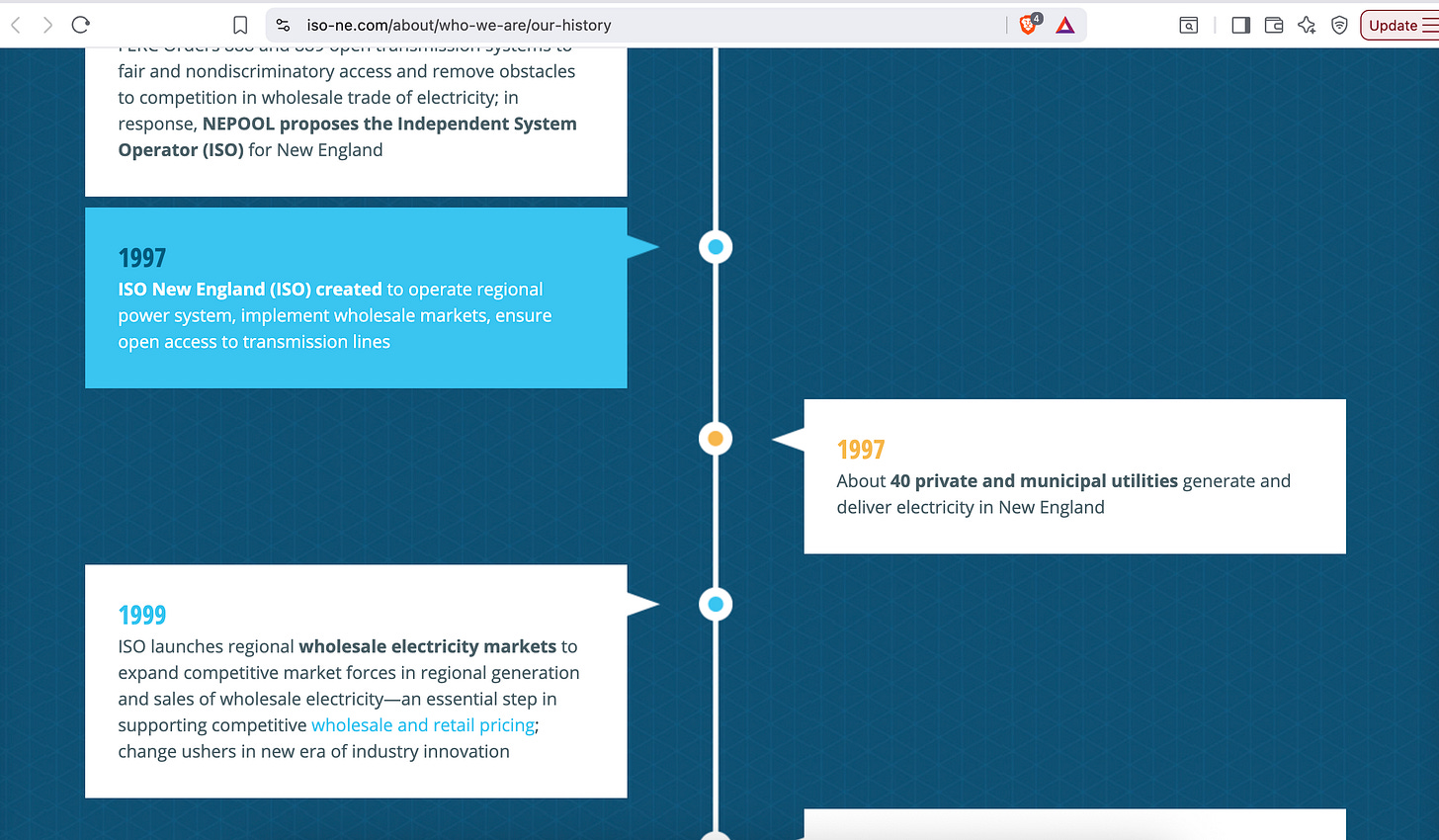 Moreover, ISO-NE has only been around since 1997! How did we get electricity before then? My guess: from the T&D, for cheaper, without an administrative layer. Has “expanding competitive market forces” done anything for the average ratepayer?