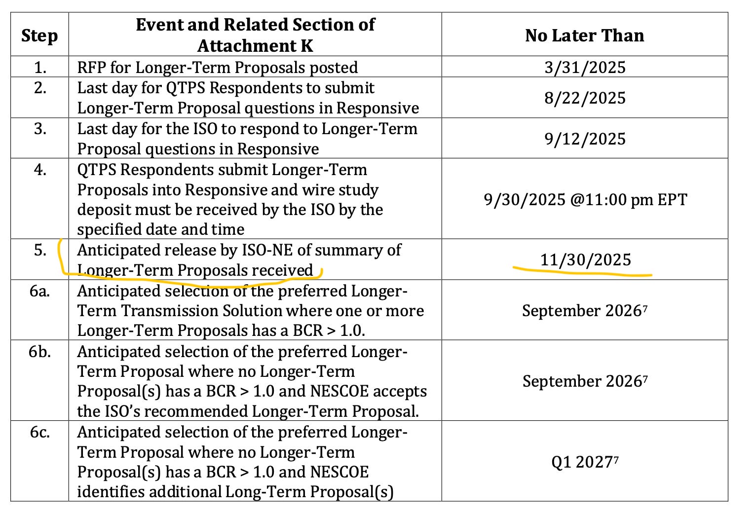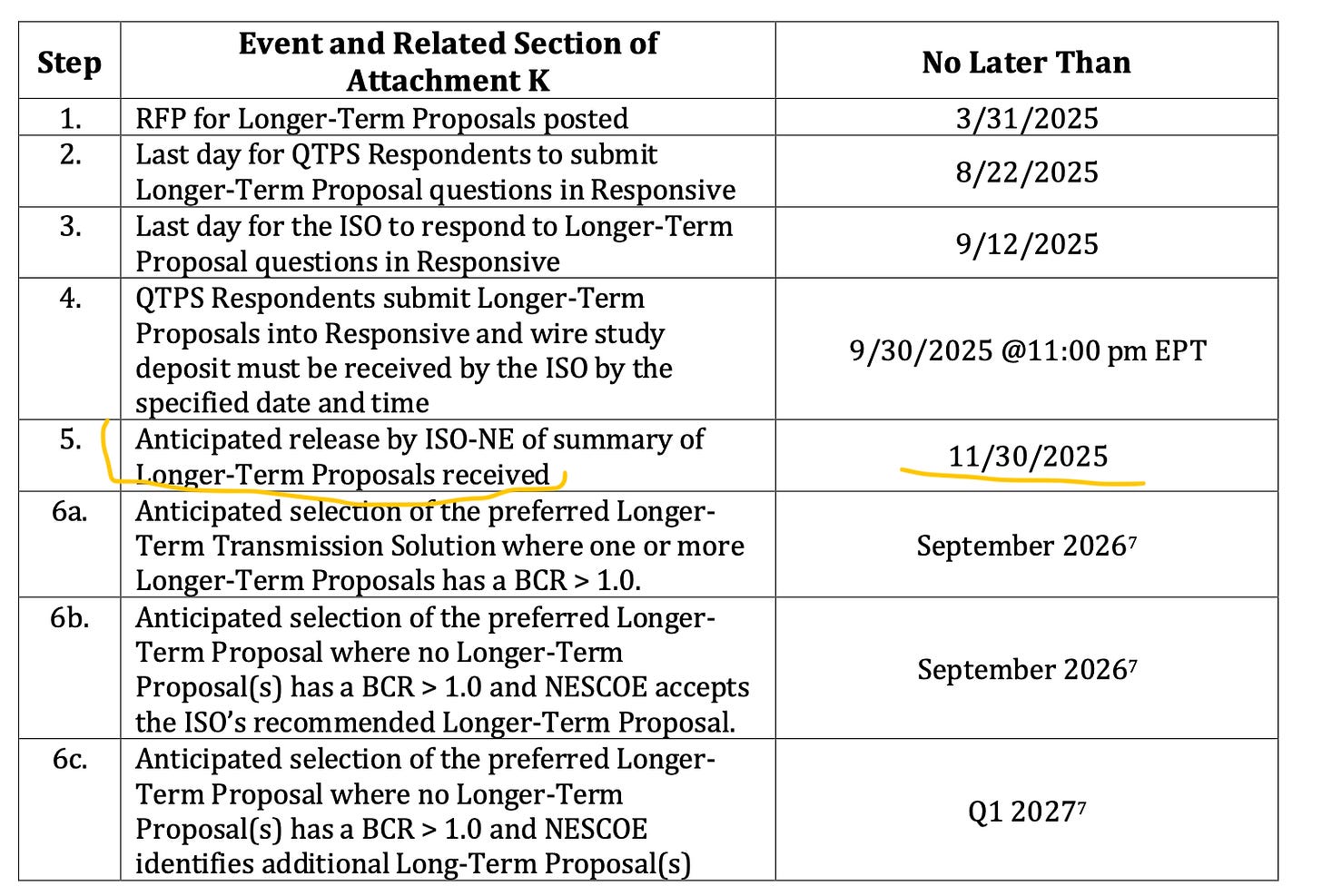 November 2025 expected summary of responses to the ISO-NE LTTU RFP. Future ISO-NE Timeline below. Source.