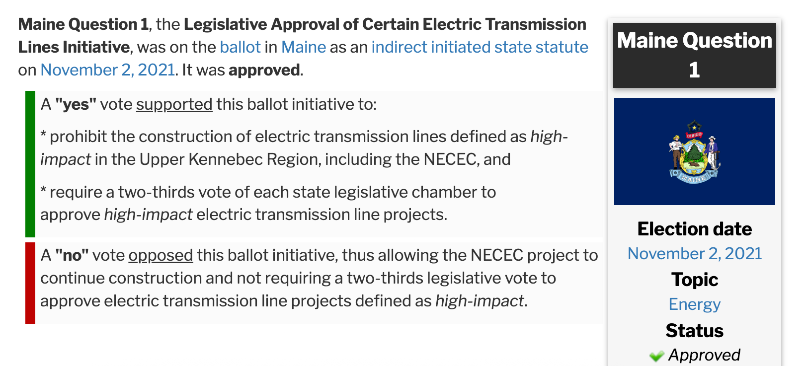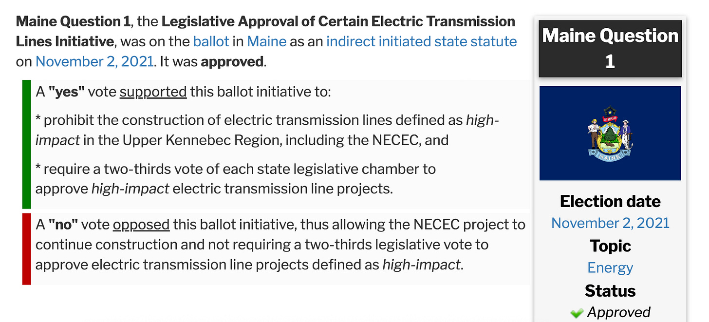 11/3/2021 Voters approved the referendum about the NECEC transmission line, which included the line: “require a two-thirds vote of each state legislative chamber to approve high-impact electric transmission line projects.” (link)