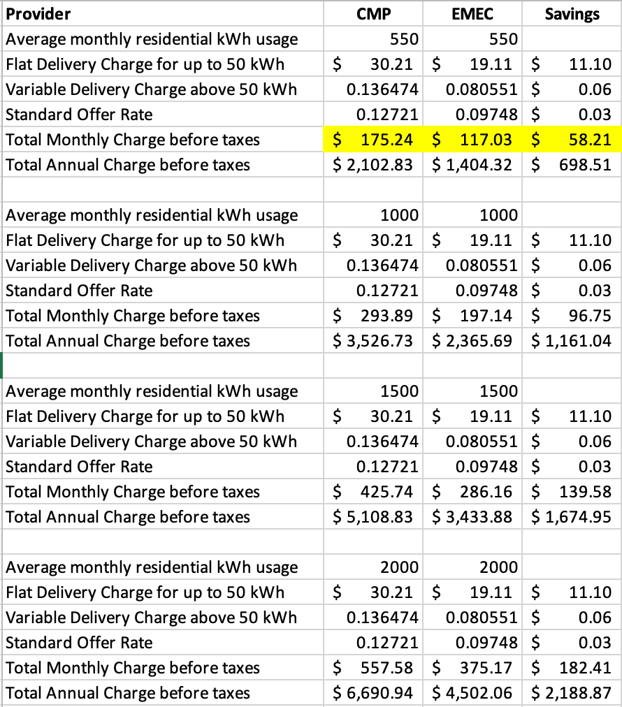 Given that I was asking this question in a chat box, I wasn’t able to quickly ask a follow-on question to clarify why I was asking this question. I recently took a look at what a hypothetical residential ratepayer, using the applicable standard offer rate, in the EMEC territory and CMP territory, would pay assuming each used 550 kWh of electricity in a given month. I selected 550 kWh as it is the current rough average usage of a ratepayer in these two territories. I selected EMEC as it is the largest consumer owned utility in the State and a member of a larger national entity known as Touchstone Energy Cooperatives. I selected CMP as I am located in their territory, and they are the largest investor-owned utility in the State and a part of a larger national and international entity. What I found is illustrated in the attached Excel spreadsheet. What you will see is that the EMEC ratepayer would have paid a total of $117.03 and the CMP ratepayer $175.24 in that given month. These amounts are before sales tax. In the same table I also included what if scenarios of 1,000, 1,500, and 2,000 kWh of usage. I also included an annualized total which is simply taking the one-month difference and multiplying by 12 months. As kWh usage is expected to increase in the future, due in part to beneficial electrification efforts, I would expect that the 550 kWh usage average will increase and that the cost delta between these two territories will expand accordingly.